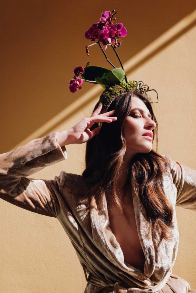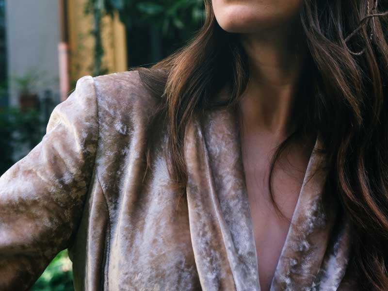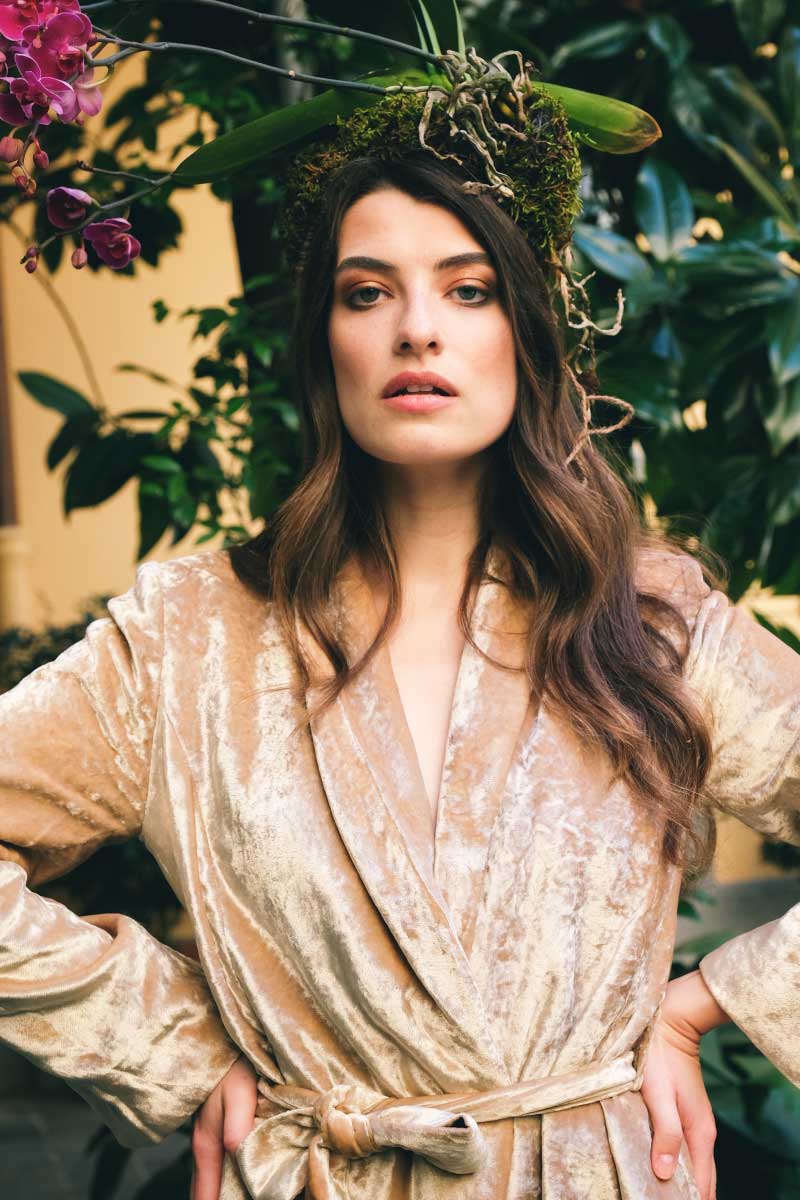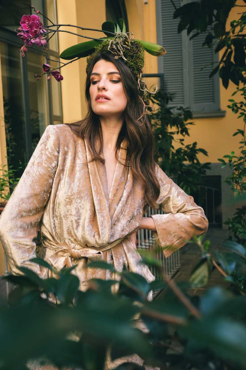 Dalla tavolozza della natura e da ciò che essa ci regala ecco un meraviglioso tailleur realizzato a mano tinto in mirto. La giacca destrutturata a kimono con cintura in vita ben si accosta al pantalone a palazzo. Il colore delle bacche di mirto appositamente spedite dalla Sardegna hanno reso questo velluto davvero magico, regalando al tessuto un colore che va dall’oro satinato di giorno al lime/argento di notte.